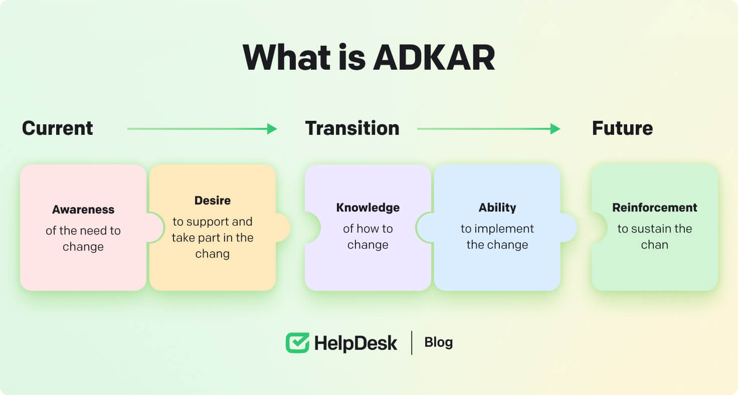 For example, if you integrate new tools like HelpDesk into your organization, change management models will help you manage resources, training, and internal and external factors.