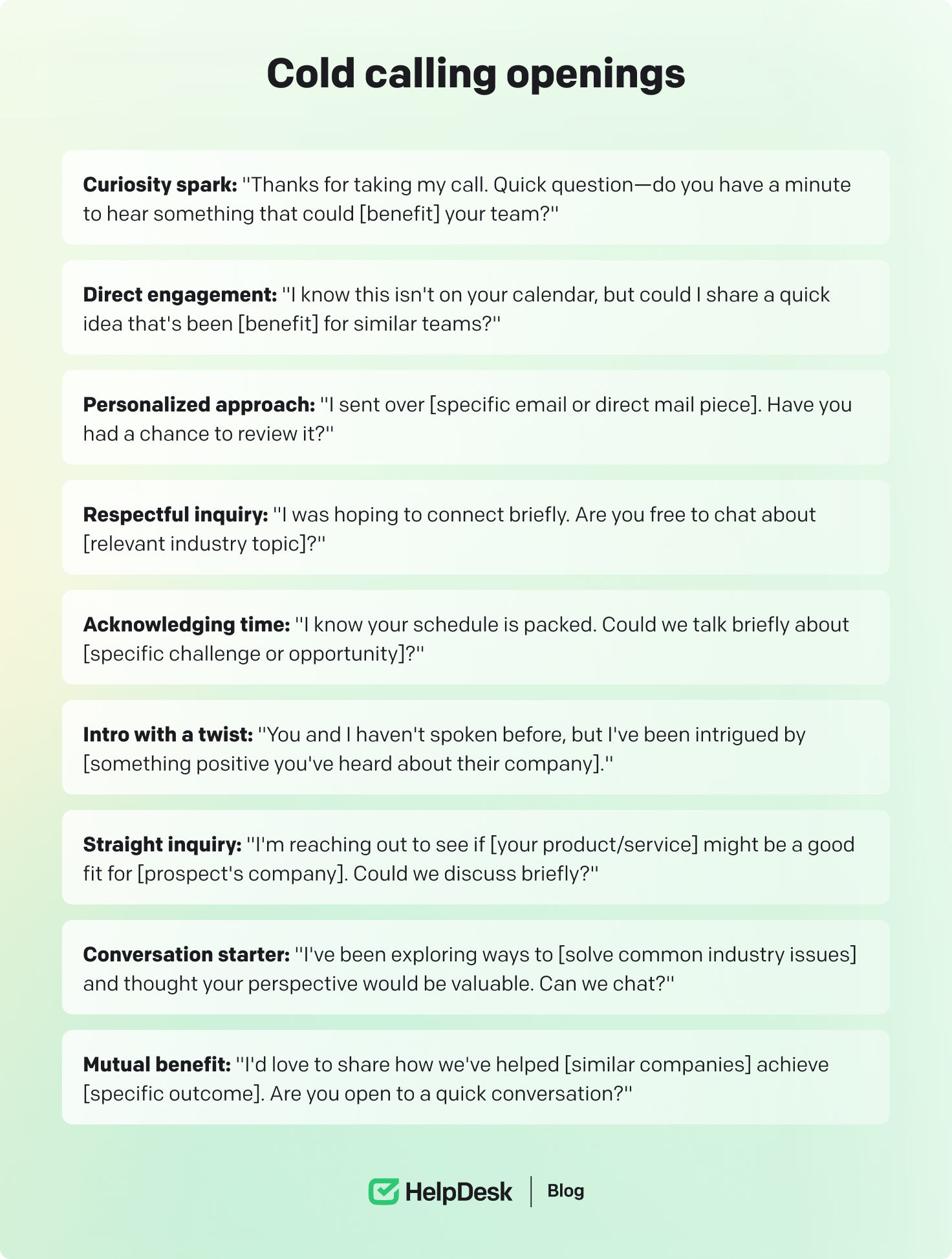 These openers are designed to capture attention by addressing relevance without immediately launching into a sales pitch. They’re intended to spark dialogue and engagement, leading to a more meaningful conversation.