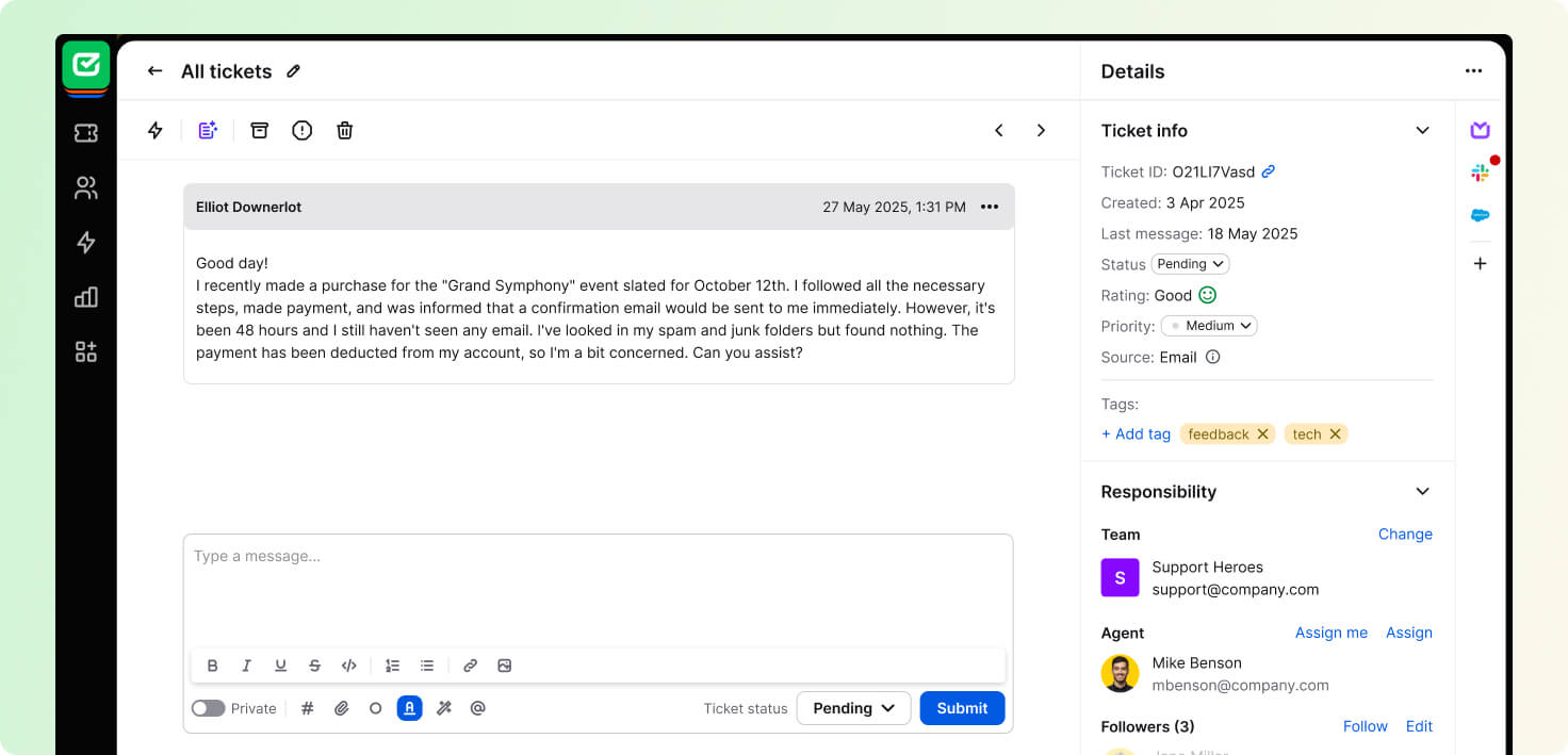 Issue resolution: With HelpDesk, resolving customer issues becomes a structured and efficient process. It facilitates this by providing support agents with intelligent suggestions and solutions. AI-powered systems can analyze the context of each ticket, recommend appropriate actions, and even automate specific resolution steps, accelerating the problem-solving process.