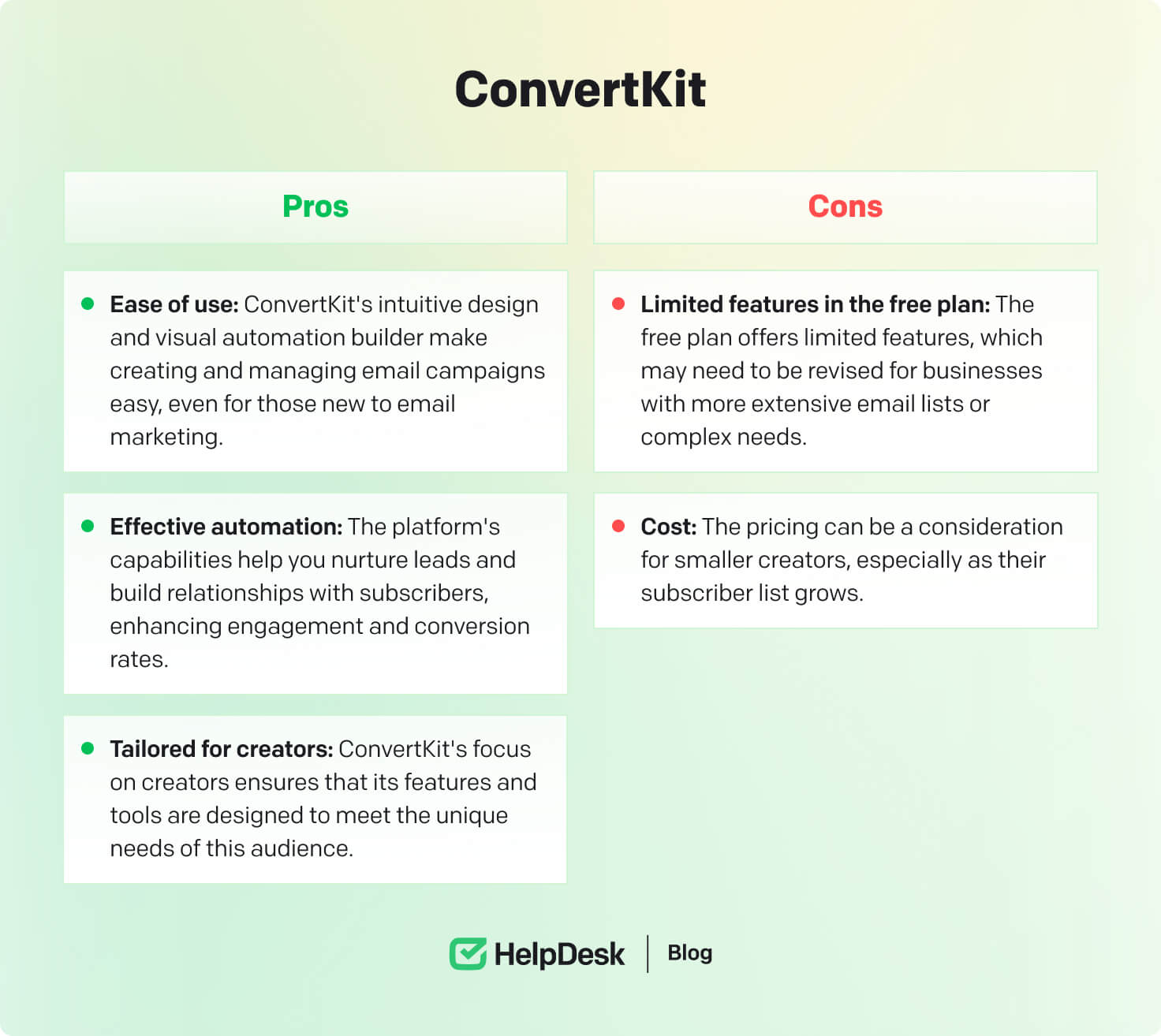 Email automation: ConvertKit’s automation features allow you to create personalized email sequences that nurture leads and build relationships with subscribers. The platform’s visual automation builder makes it easy to design workflows.
