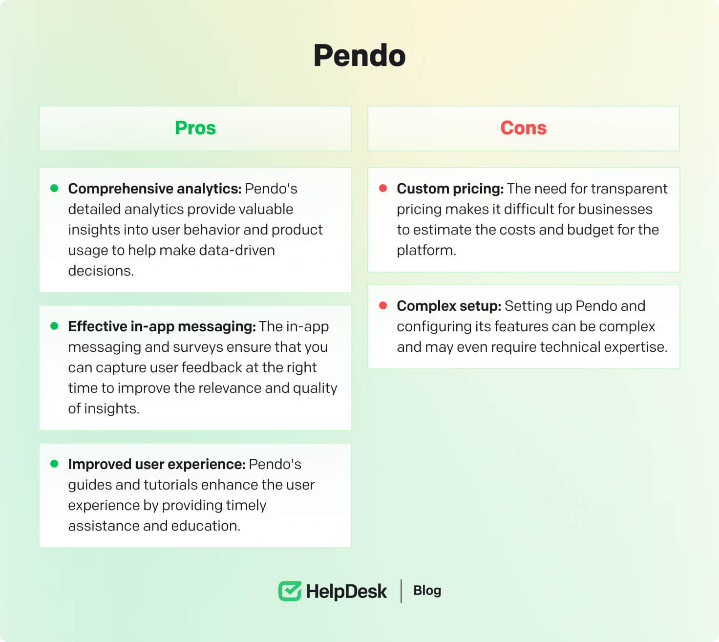 Product analytics: Pendo offers detailed analytics on user behavior and product usage to help customers understand how they interact with their software.