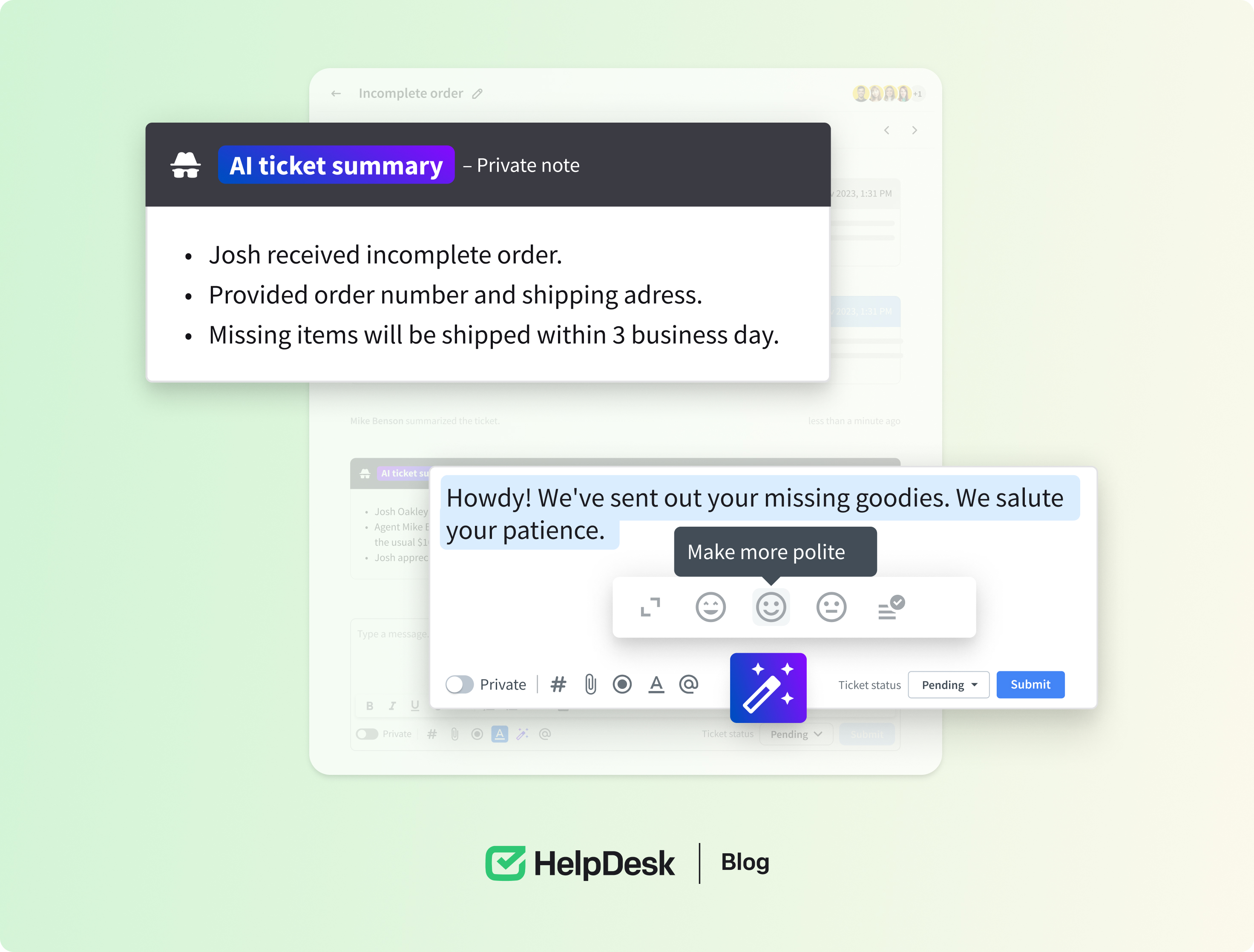 Ticket summarization: AI quickly generates concise summaries of customer queries, allowing support agents to grasp the context at a glance.
