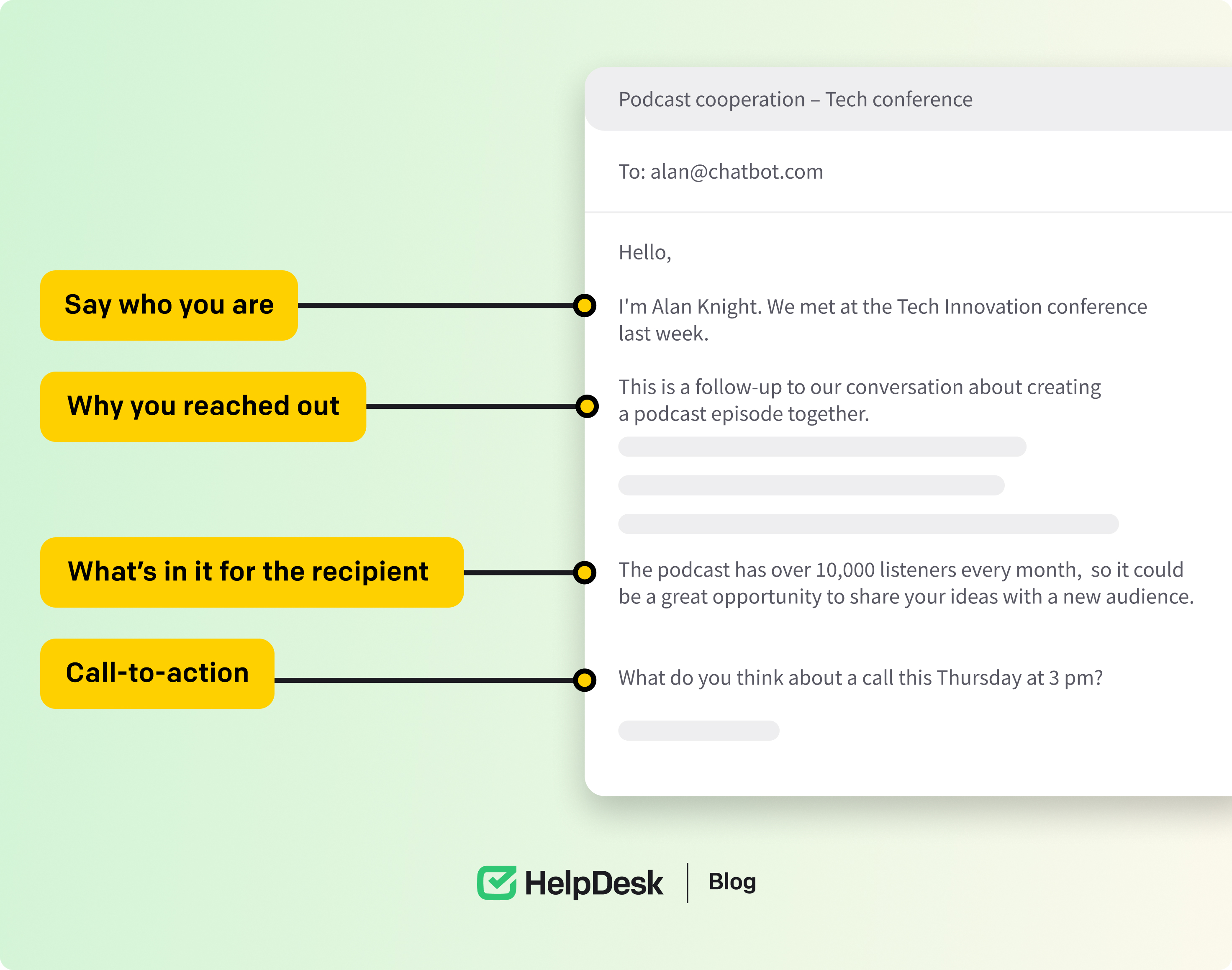 Next, you should introduce yourself, especially if this is your first interaction with the recipient. The purpose is to inform the other person about who you are, what you do, and why you are reaching out. For example, you can say, “Hey, Alex here — the sales manager at Pablo Hub.”