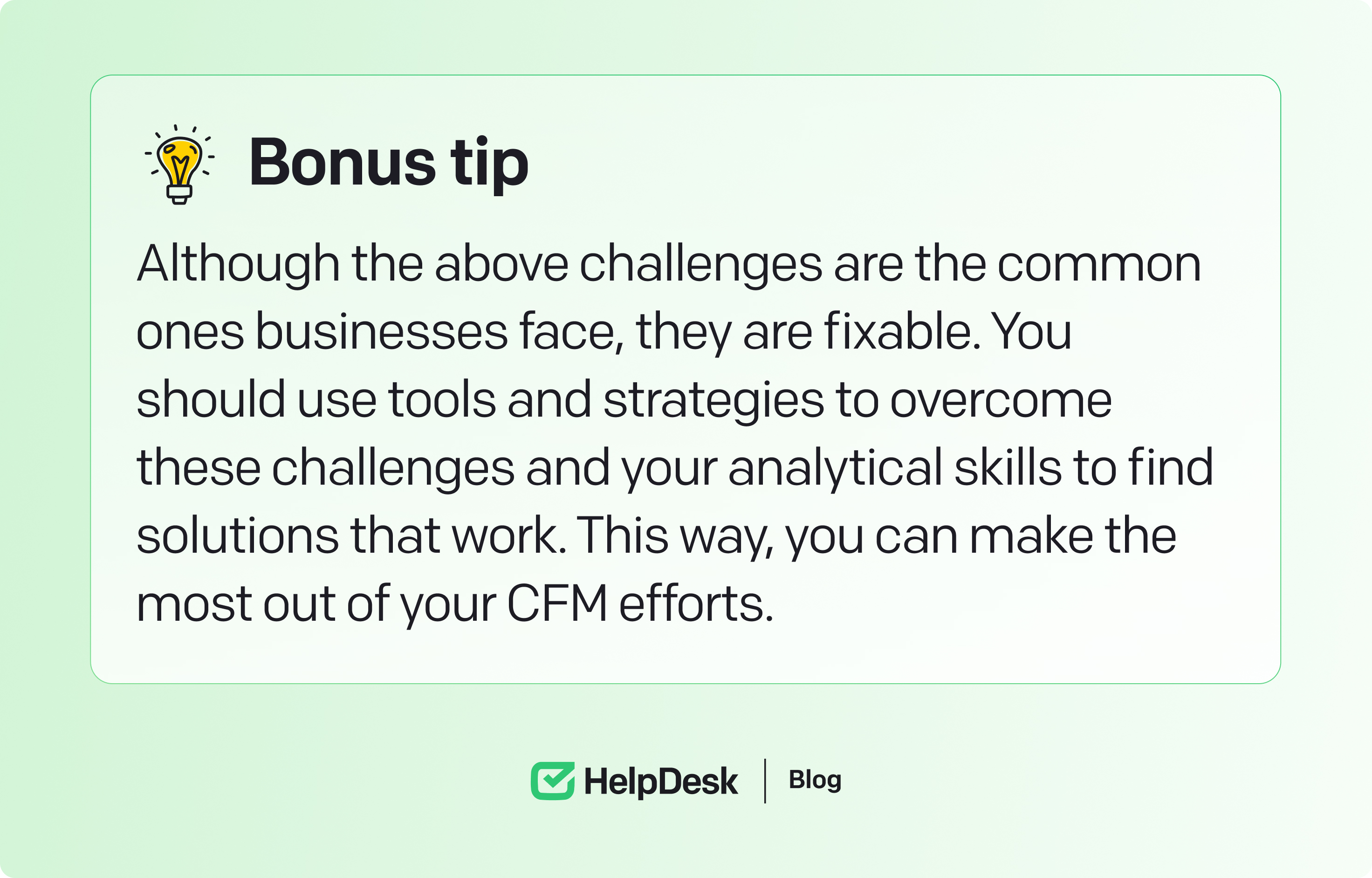 There are many key performance indicators (KPIs) that reflect the success of CFM. Some of the key ones are as follows: