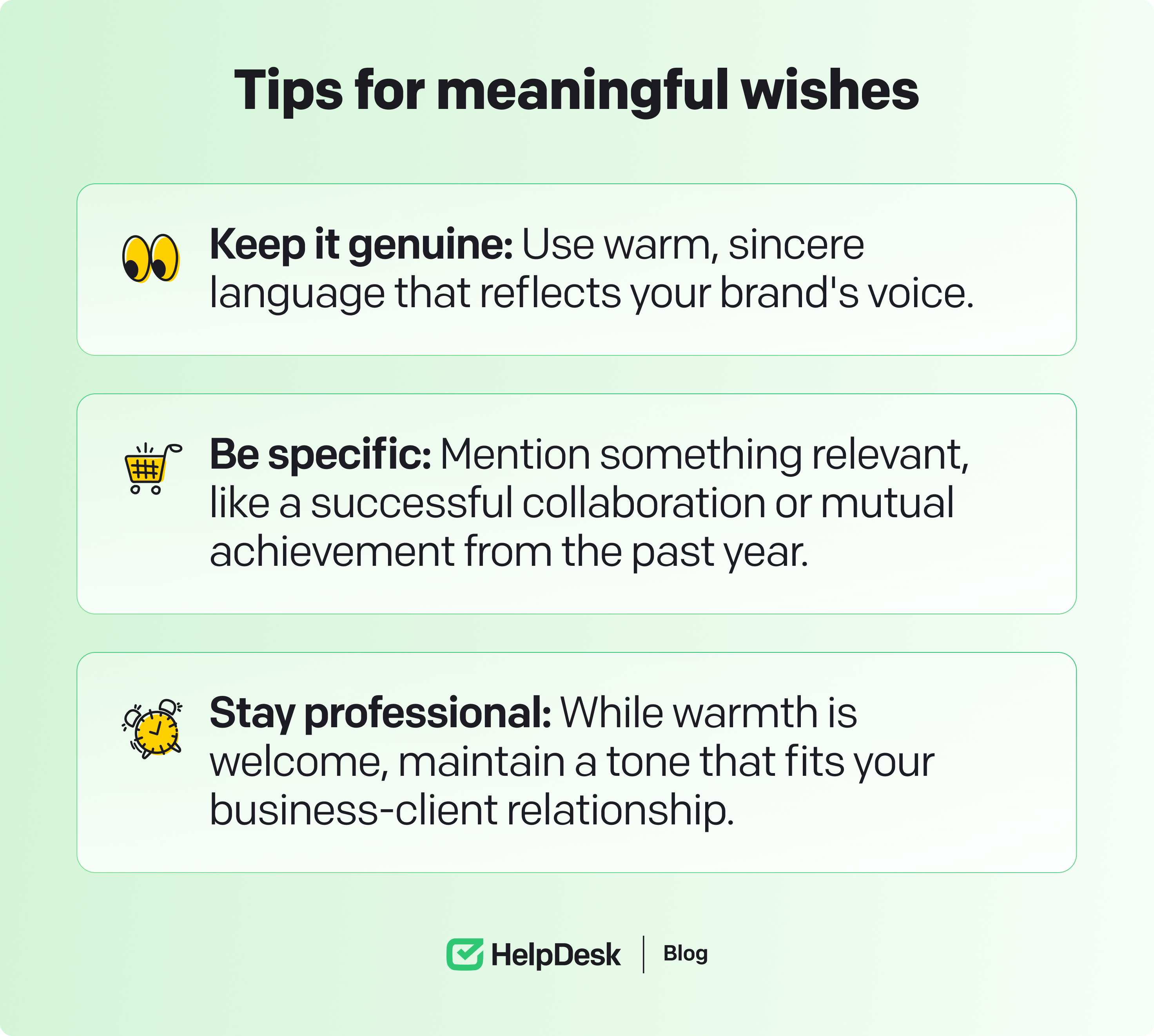 Avoiding generic messages: Generic messages can blend into the sea of other greetings your clients receive. Customizing your wishes with personal touches or specific references makes your communication stand out and shows you value your relationship. Mentioning a shared success or expressing excitement for upcoming projects signals that you put thought into the message, reinforcing trust and strengthening your connection.