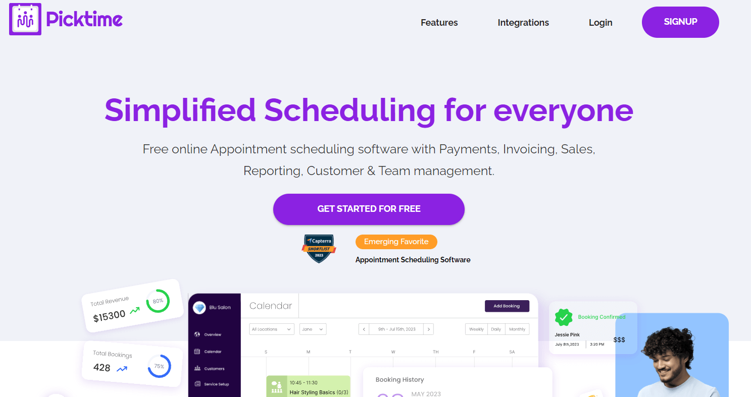 Picktime, as a service scheduling app, specializes in getting a business booking system client-ready as quickly as possible. And for no cost to the business, it boasts one of the most generous free plans we’ve ever seen. The tool offers unlimited appointments and allows use from up to two locations and three team members.