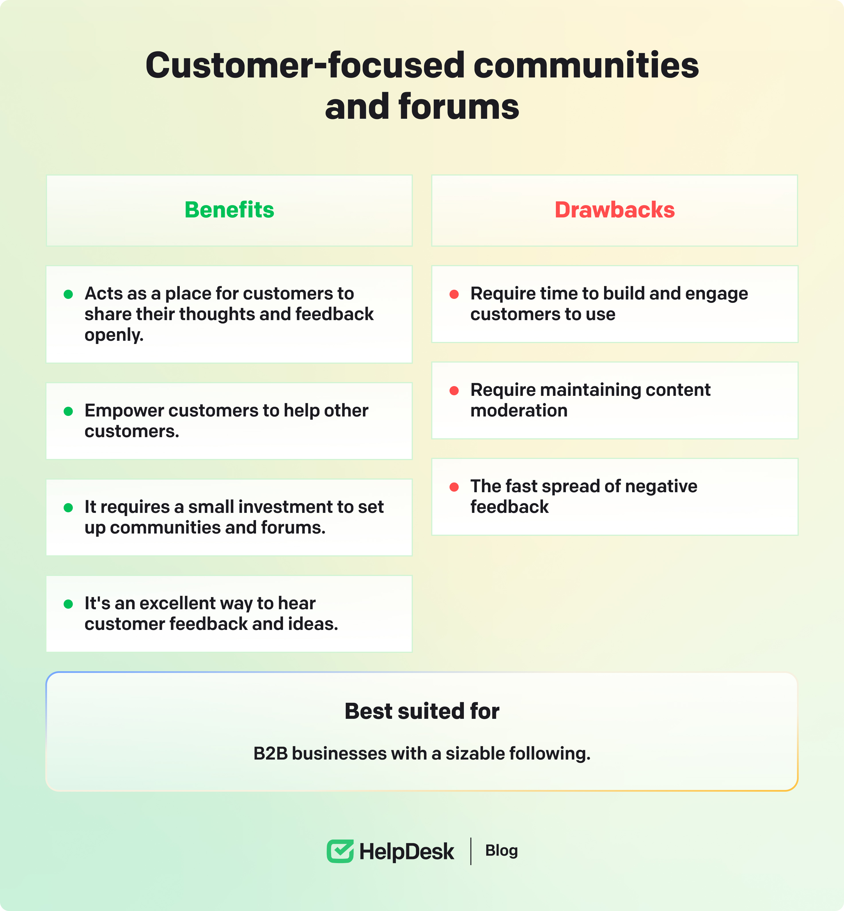 Establishing customer-focused communities and forums is an excellent way to utilize customer resources and cultivate a loyal community. Your customers become voluntary customer service representatives, guiding other customers with their issues. Additionally, this platform provides an ideal space for gathering customer feedback and insights. However, it’s important to note that building and maintaining such communities and forums takes time.