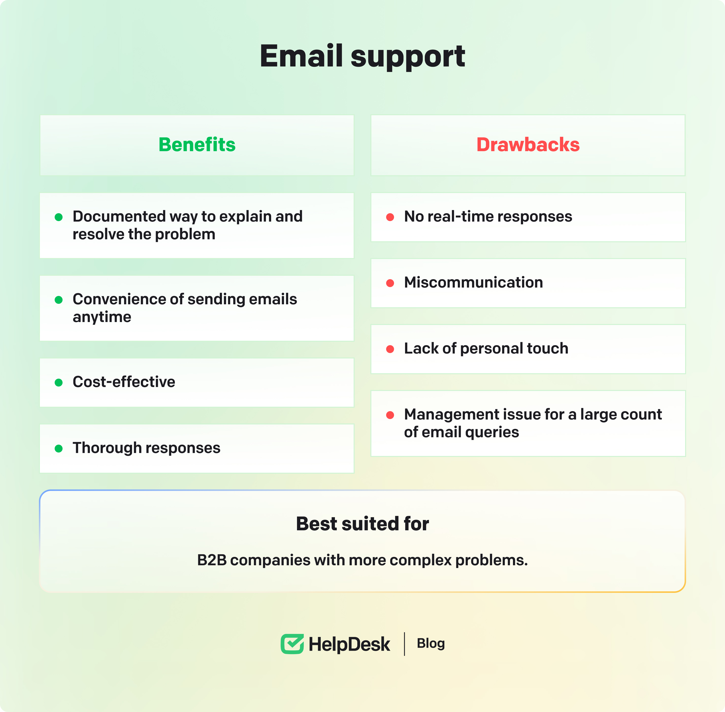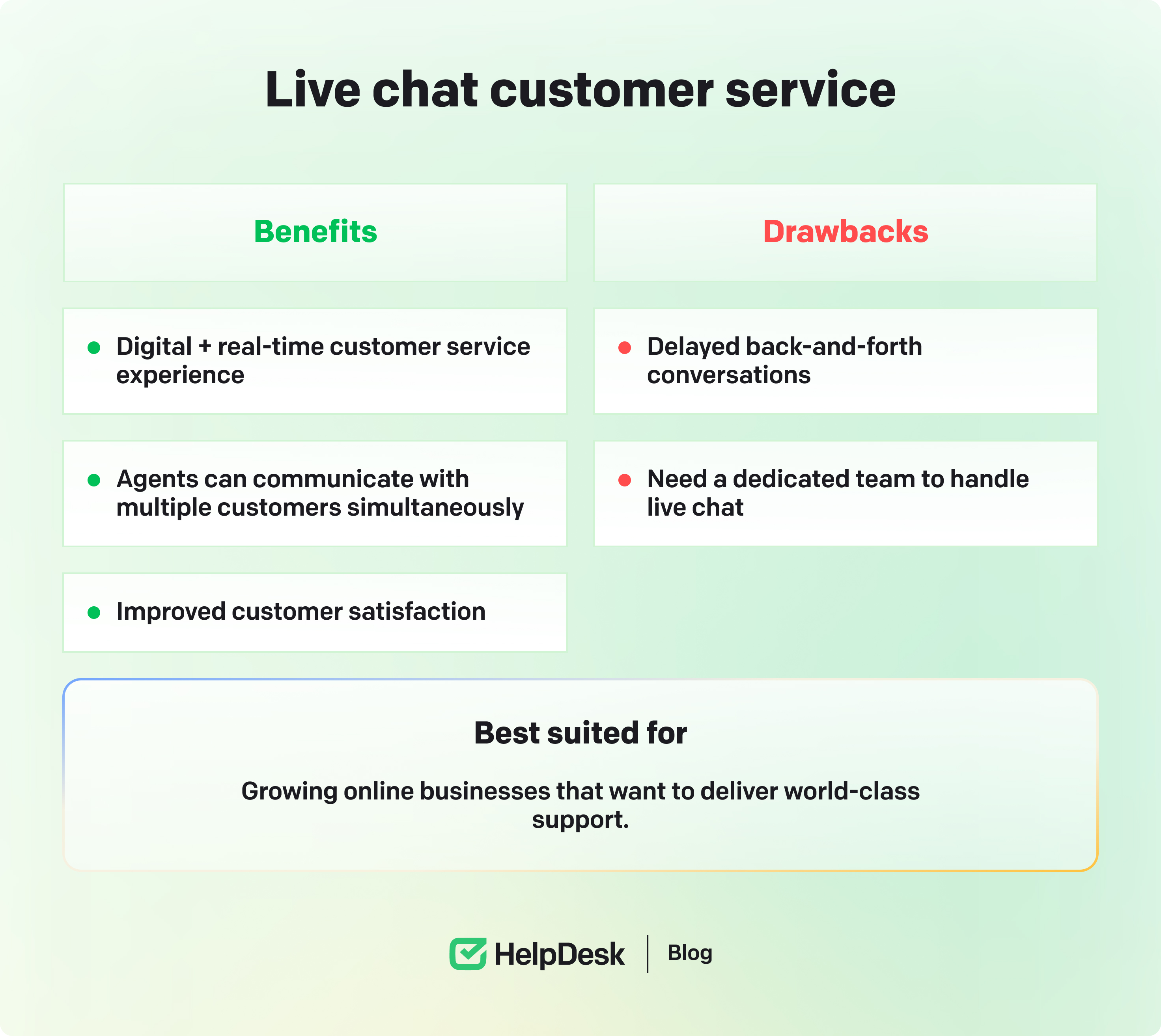 Self-service customer service also frees customer support teams from repetitive FAQ queries and lets them focus on more complex issues. Although it’s a low-cost and convenient way to provide customer support, it requires regular maintenance and updates.