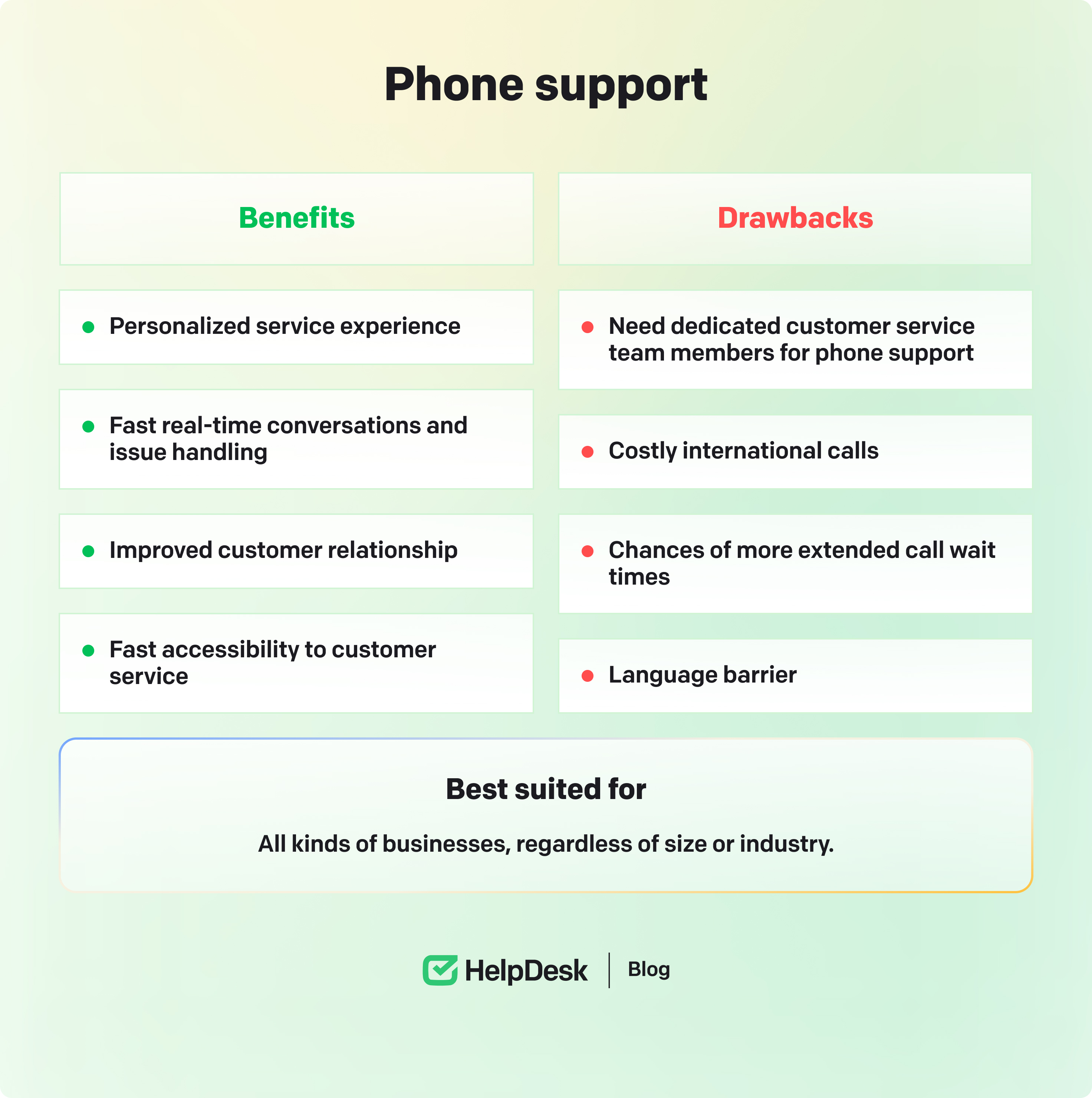 Phone support is one of the most popular types of customer service. It involves speaking to a real person over the phone. The customer service representative and the customer have verbal conversations through voice calls via mobile phones, landlines, or other applications.
